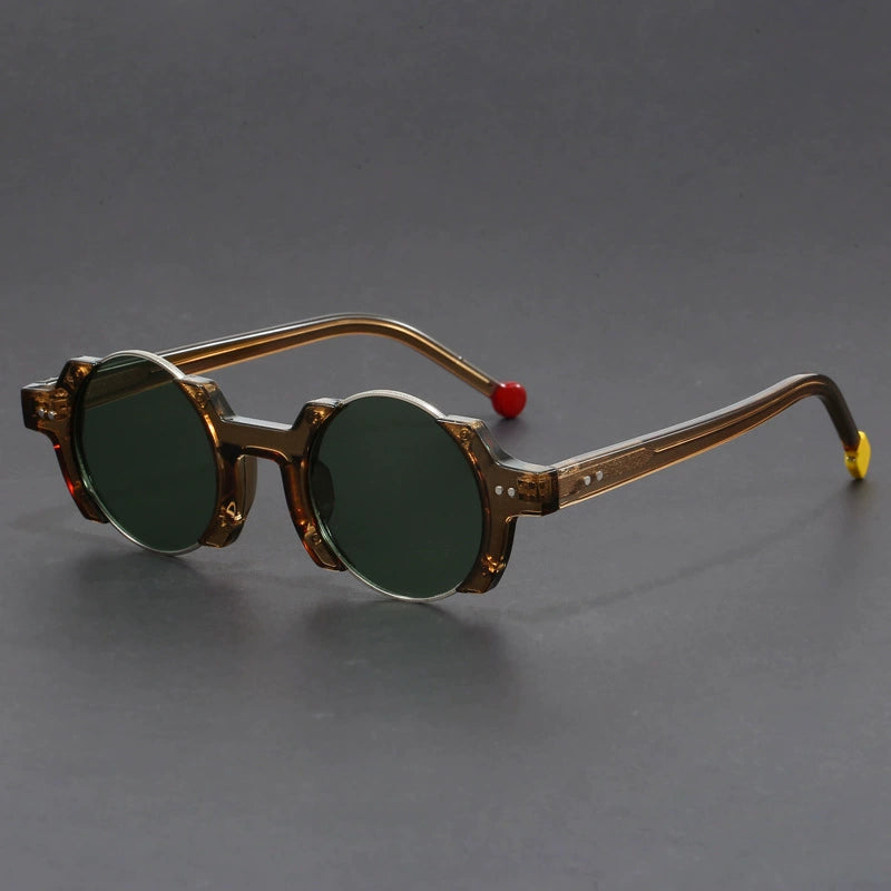 Urban by nature and unapologetically offbeat, these sunglasses turn everyday frames into a statement piece. Round lenses meet sharp, architectural edges for a shape that’s both artistic and rebellious, made for those who never wear anything the “right” way.