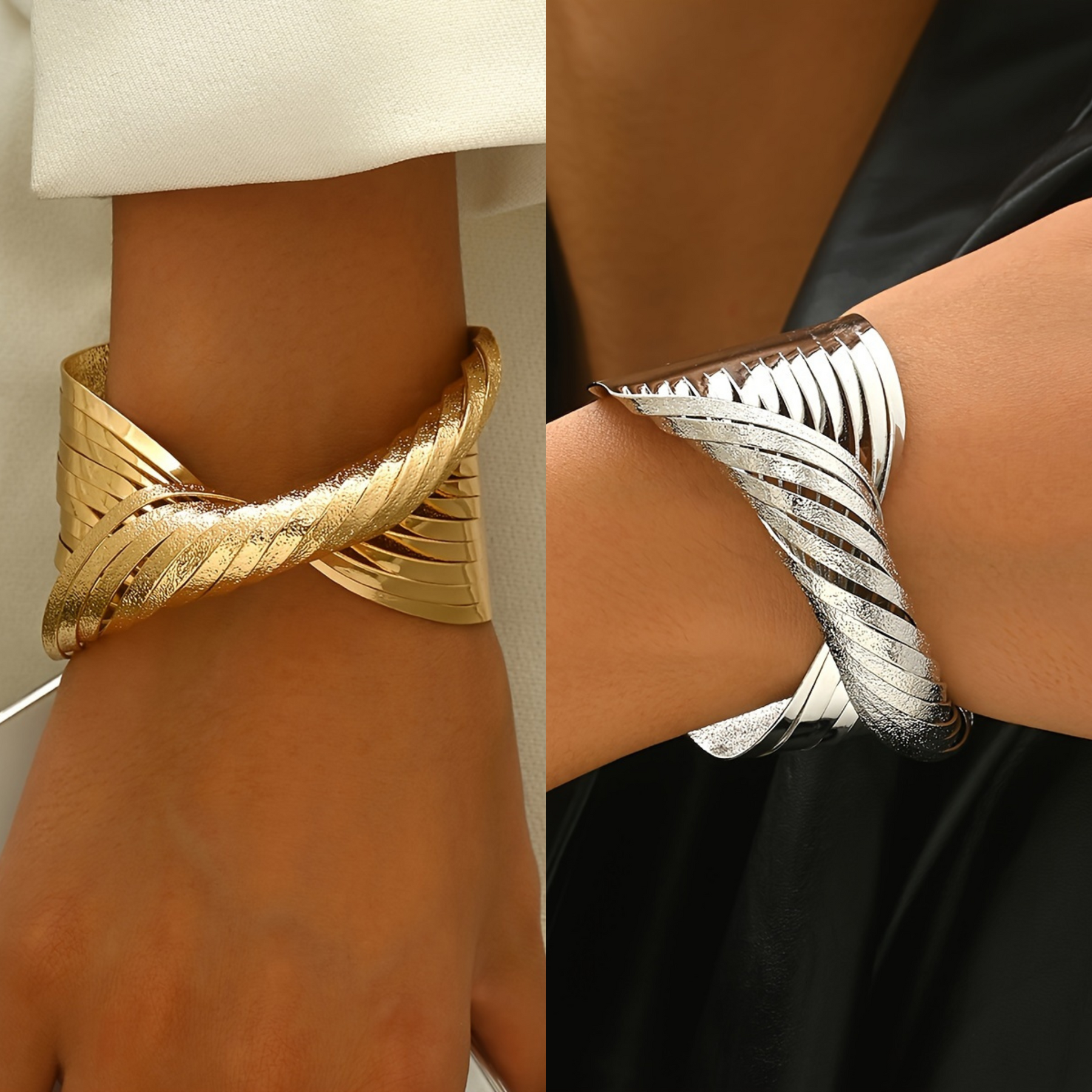 This sculpted cuff is for the woman who owns her presence and turns heads without trying. With its twisted design and glowing finish, it wraps around your wrist like it was made for you. The open fit adjusts to your shape, giving you the freedom to wear it your way. Elegant, powerful, unforgettable.